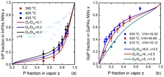 Stationary vapor–solid distributions of (a) Au-catalyzed InPxAs1−x NW sections at three different temperatures shown in the legend [], and (b) Ga-catalyzed GaPxAs1−x NWs/NW sections at different temperatures and total V/flux ratios shown in the legend [,,] (symbols), fitted by Equation (14) with the parameters shown in the legends (lines).