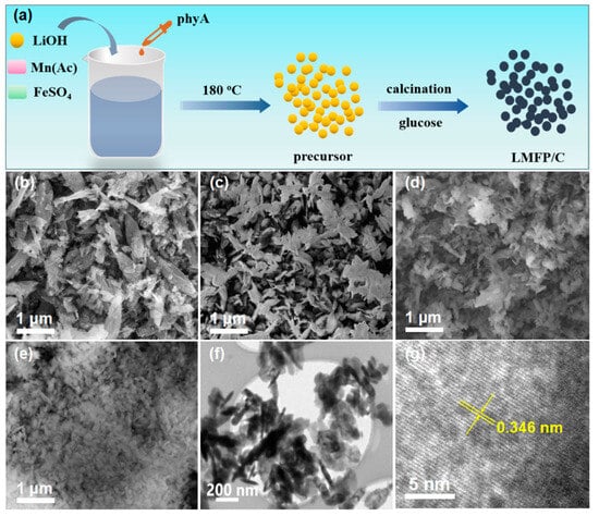 (a) Schematic illustration for the fabrication of LMFP/C-x. SEM images of (b) LMP/C, (c) LMFP/C-0.1, (d) LMFP/C-0.2, and (e) LMFP/C-0.4. (f) TEM and (g) HRTEM images of LMFP/C-0.2.