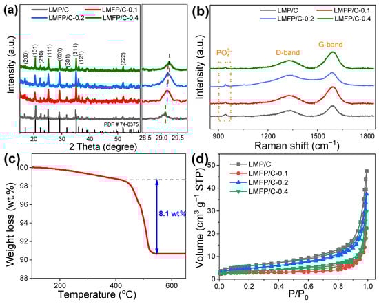 XRD patterns of LMFP/C-x samples are displayed in Figure 2a. Apparently, the major peaks are well indexed as an LMP phase (JCPDS card no. 74-0375) with an olivine-type structure. It is worth pointing out that there is a gradually positive shift of the (020) peak with the increasing of the Fe doping amount, which is related to the minor contraction of the lattice resulting from the differences in the radii of Fe2+ (0.65 Å) and Mn2+ (0.80 Å). This phenomenon also testifies to the successful doping of Fe element into the LMP lattice. The structural information is further detected by Raman spectra (Figure 2b). The weak characteristic peaks of PO43− centered at ~944 cm−1 are monitored in all samples. The other two distinct broad peaks belonging to the disordered carbon (D-, 1340 cm−1) and the graphitic carbon (G-, 1590 cm−1) testify to the presence of carbon species [13,24,37]. TGA analysis reveals that the carbon content in LMFP/C-0.2 is approximately 8.1 wt% (Figure 2c). The electronic conductivity is believed to be enhanced by the carbon species. The porous structure of LMFP/C-x was characterized by N2 adsorption–desorption tests (Figure 2d). According to the IUPAC classification, all samples deliver type IV isotherms with H3 hysteresis loops in the range of 0.5 < P/P0 < 1, proving the formation of mesoporous structures [8,35]. The BET specific surface areas of LMP/C, LMFP/C-0.1, LMFP/C-0.2, and LMFP/C-0.4 particles are determined to be 25.6, 15.8, 21.7, and 18.3 m2 g−1, respectively. The unique porous structure with large specific surface area is beneficial for electron migration and electrochemical reactions.