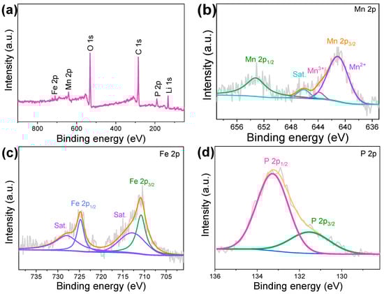 (a) XPS survey spectrum of LMFP/C-0.2. High-resolution XPS spectra of (b) Mn 2p, (c) Fe 2p, and (d) P 2p of LMFP/C-0.2.