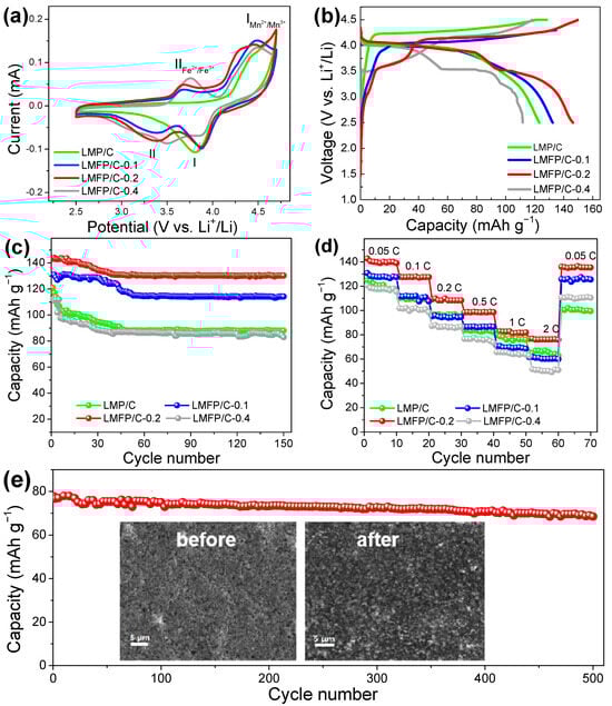 (a) CV curves at a scan rate of 0.05 mV s−1, (b) charge/discharge curves, (c) cycling stabilities at 0.05 C, and (d) rate performances of LMFP/C, LMFP/C-0.1, LMFP/C-0.2, and LMFP/C-0.4. (e) Long-term stability of LMFP/C-0.2 at 2 C (inset: SEM images of the electrode before (left) and after (right) cycling test).