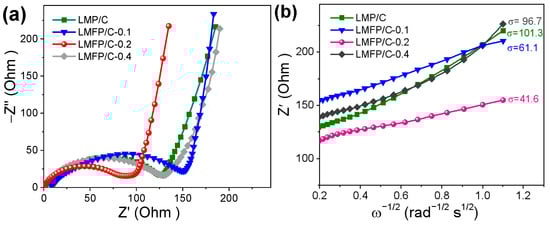 To understand in depth the underlying mechanism of the enhanced electrode kinetics, Nyquist plots of LMFP/C-x are measured. As displayed in Figure 5a, all plots consist of a compressed semicircle representing the charge transfer impedance (high-frequency region) and a diagonal line corresponding to the Warburg impedance (low-frequency range). Compared to other electrodes, the LMFP/C-0.2 electrode yielded the smallest diameter of the semicircle (i.e., Rct: ~89 Ω) and the steepest slope of the oblique line, illustrating an accelerated charge transfer ability and the Li ions’ diffusion efficiency. The Warburg factor (σ) is related to the Li ion diffusion coefficient (DLi+), which can be calculated using the following formula [35]: