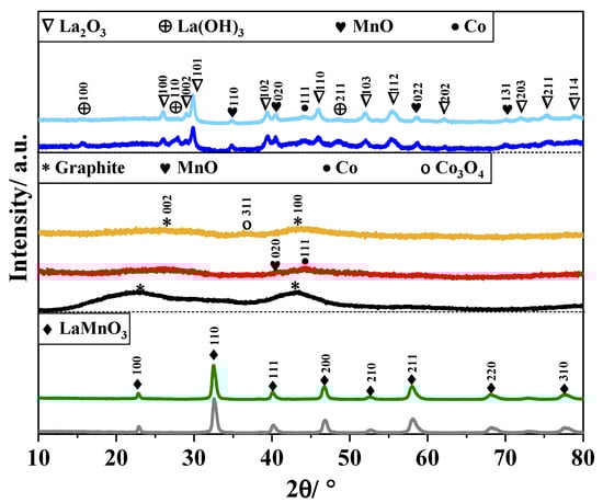 - Liu, X.; Gong, H.; Wang, T.; Guo, H.; Song, L.; Xia, W.; Gao, B.; Jiang, Z.; Feng, L.; He, J. Cobalt-Doped Perovskite-Type Oxide LaMnO3 as Bifunctional Oxygen Catalysts for Hybrid Lithium-Oxygen Batteries. Chem. Asian J. 2018, 13, 528–535. [Google Scholar] [CrossRef] [PubMed]
