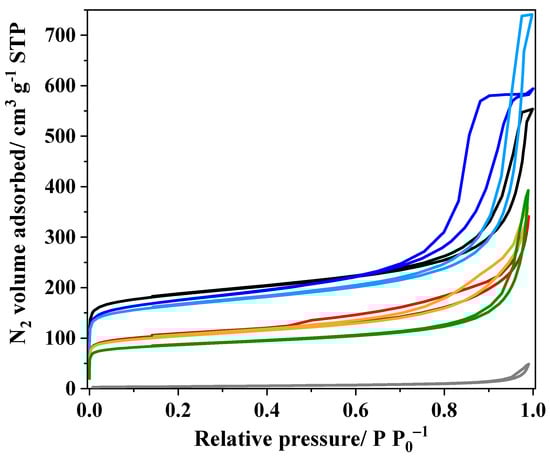 - Thommes, M.; Kaneko, K.; Neimark, A.V.; Olivier, J.P.; Rodriguez-Reinoso, F.; Rouquerol, J.; Sing, K.S.W. Physisorption of gases, with special reference to the evaluation of surface area and pore size distribution (IUPAC Technical Report). Pure Appl. Chem. 2015, 87, 1051–1069. [Google Scholar] [CrossRef]