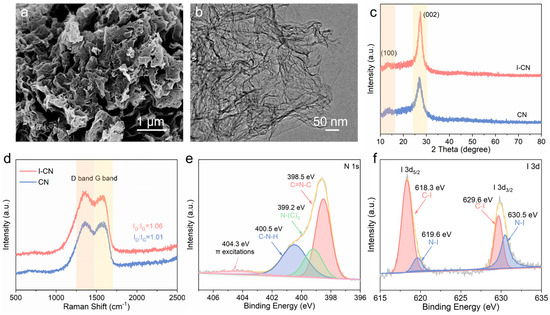 The morphology and structure of I-CN were elucidated using scanning electron microscopy (SEM) and transmission electron microscopy (TEM). As illustrated in Figure 1a, the microscopic morphology of the prepared I-CN shows irregularly coiled nanosheets with porous structures, maintaining the basic structure of CN on the whole shown in the previous study [23]. The TEM image of I-CN (Figure 1b) shows similar characterization to CN. It clearly shows that I-CN has a coiled sheet structure with numerous pores and surface defects, which facilitate the mass transfer process and thereby enhance the photocatalytic reaction.