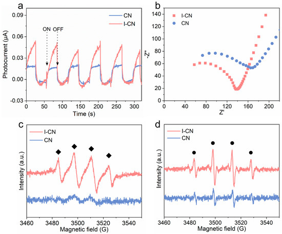 (a) Photocurrent response; (b) Nyquist diagram of I-CN and CN; DMPO spin-trapping EPR spectra for (c) O2•− and (d) •OH under irradiation-simulated visible light (• represents DMPO–•OH and ◆ represents DMPO–O2•−).
