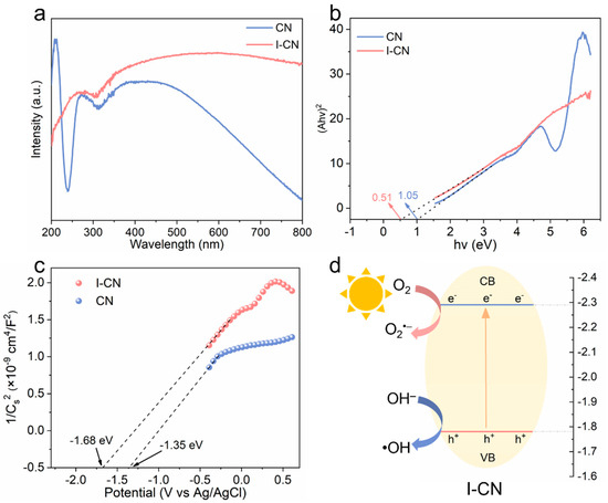 (a) UV/Vis DRS spectra, (b) Tauc plots, (c) Mott–Schottky plots, and (d) band structure and photocatalytic mechanism of I-CN.