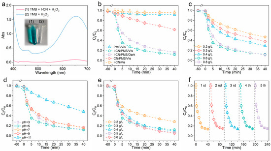 (a) Absorption curves of TMB chromogenic reaction catalyzed by I-CN; (b) degradation of SMX in various systems; influence of (c) catalyst dose, (d) PMS dose, and (e) initial pH on SMX degradation in I-CN/PMS/Vis system; (f) recycling use of I-CN for degradation of SMX via PMS activation over five consecutive cycles. Reaction conditions: [SMX] = 10 mg/L; [catalyst] = 0.6 g/L; [PMS] = 0.3 g/L; initial pH = 5.