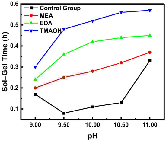 The sol–gel time is a common method used to assess the stability of colloidal dispersions. Generally, longer sol–gel times indicated better colloidal stability. Figure 1 shows that the sol–gel times of the experimental groups at different pH levels were significantly longer compared to the control group. This suggested that the stability of silica sol synthesized directly with organic amines as catalysts was superior to that of neutral silica sol with added alkali. Within the pH range of 9.00–11.00, the stability of the control group initially decreased and then increased as pH increased, a trend explained by our previous experiments using the non-DLVO theory [19]. In contrast, the stability of silica sol in the experimental groups continued to increase. In addition, at equivalent pH levels, the stability of silica synthesized with different organic amines as catalysts varied notably and decreased in the following order: TMAOH exhibited the highest stability, followed by EDA and then MEA.