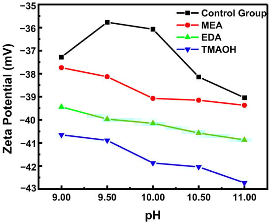 The change in zeta potential also reflected the stability of silica sol, with a higher absolute zeta potential indicating better colloidal stability. In the control group, the absolute zeta potential initially decreased and then increased with increasing pH, as shown in Figure 2. In contrast, the absolute zeta potential of silica sol in experimental groups showed a continuous increase, consistent with the results from sol–gel experiments. Furthermore, at the same pH, the absolute zeta potential values of silica sol synthesized using three different organic bases ranked highest to lowest as follows: TMAOH, EDA, and MEA.