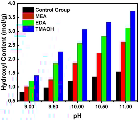 The reasons for enhanced stability were further elucidated by quantitatively analyzing the hydroxyl content of silica. Silica synthesized using organic amines as catalysts exhibited significantly higher hydroxyl content compared to the control group (Figure 3). Meanwhile, increasing concentrations of organic amines corresponded to higher hydroxyl content. Additionally, catalysts with equal pH of MEA, EDA, and TMAOH showed notable variations in hydroxyl concentration. Silica synthesized with TMAOH as the catalyst demonstrated the highest hydroxyl concentration, followed sequentially by EDA and MEA. These results underscored that increased hydroxyl content substantially enhanced the stability of silica sol, consistent with prior sol–gel experiments and zeta potential data.