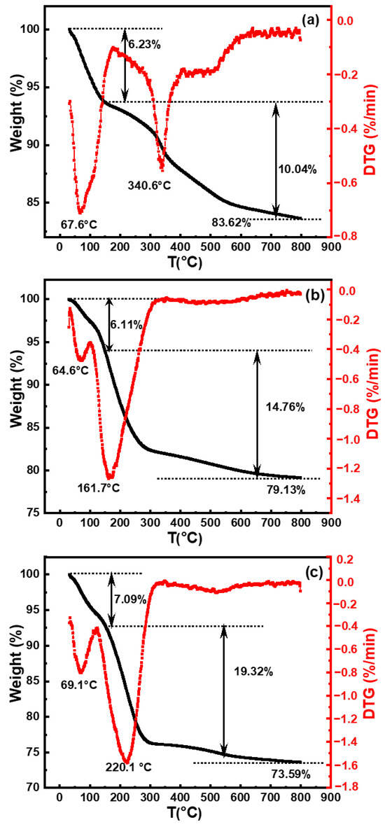 Thermogravimetric analysis (TGA, black line) and derivative thermogravimetry (DTG, red line) curves of SiO2 synthesized with different organic amine catalysts at pH = 10.50: (a) MEA, (b) EDA, and (c) TMAOH.