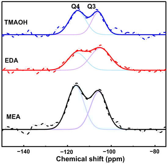 The 29Si solid-state NMR spectra provided quantitative insights into the cross-linking of the silica network structure by examining the ratio of Q4/Q3 [18], as depicted in Figure 5. In these spectra, signals at −102 ppm and −112 ppm were assigned to Q3 and Q4 species [14], which were represented by purple and blue lines, respectively. In NMR terminology, Qn denotes silicon atoms where n indicates the number of bridging oxygens bonded to the central silicon. Specifically, Q4 refers to silicon atoms with four Si-O-Si bonds, while Q3 denotes silicon atoms with three Si-O-Si bonds and one Si-OH bond.