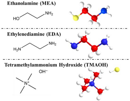 Based on the preceding analysis of silanol groups, a detailed exposition of the mode of action of organic amines on silica was presented. The molecular structural formulas and 3D models of three organic amine molecules are displayed in Figure 6, emphasizing the amino and hydroxyl groups.