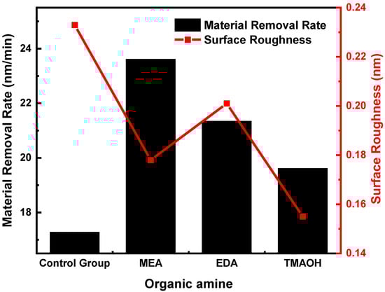 The material removal rate (MRR) and surface roughness (Ra) of silicon wafers using the control group and experimental group polishing slurry with a pH of 10.50 are shown in Figure 8. The analysis of MRR data clearly demonstrated that silica sol in experimental groups achieved significantly higher removal rates in comparison to the control group. A higher hydroxyl content was more favorable for surface protection, which led to a decrease in the polishing rate as the hydroxyl content increased. Therefore, the polishing rate was in the following order: MEA > EDA > TMAOH.