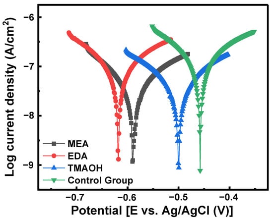The potential polarization diagrams of silicon in slurries from both the control group and the experimental groups are presented in Figure 10. Table 3 illustrates the corrosion potential (Ecorr), corrosion current density (Icorr), and inhibition efficiency (IE%). Ecorr and Icorr were determined using the Tafel method, while IE% was calculated using Equation (9). Compared to the control group, the corrosion current density decreased in the other three experimental groups using MEA-, EDA-, and TMAOH-catalyzed silica sols. Specifically, TMAOH-catalyzed silica sol exhibited the lowest corrosion current density and highest inhibition efficiency, indicating the formation of a passivation film on the silicon wafer surface and reducing the erosive impact of the polishing slurry, thereby improving the surface quality post-polishing. In addition, the protective effect of the TMAOH group was superior to that of the MEA group and EDA group.