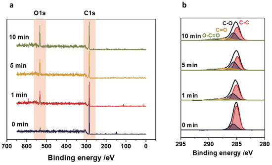 The XPS results also permit us to characterize the chemical nature of the generated functional groups. The narrow scan XPS spectra, including the analysis of C 1s peak, are shown in Figure 3b. As expected, a broadening of the C 1s peak was observed after the plasma treatment, which is related to its oxidation resulting from the generation of oxygen groups. After 1 min of oxygen plasma, the new component can be distinguished at 287 eV, corresponding to hydroxyl (-OH) and carbonyl groups (-C=O). After 5 min of the plasma treatment, a new peak at 288 eV can be distinguished and assigned to carboxyl bonds (O–C=O) [23]. Following the application of a plasma treatment for 10 min, the peak with the broadest distribution is observed, corresponding to the carbon–oxygen bonds. This clearly indicates the increase in the concentration of functional groups on the surface of the polypropylene with the time of exposure to oxygen plasma.