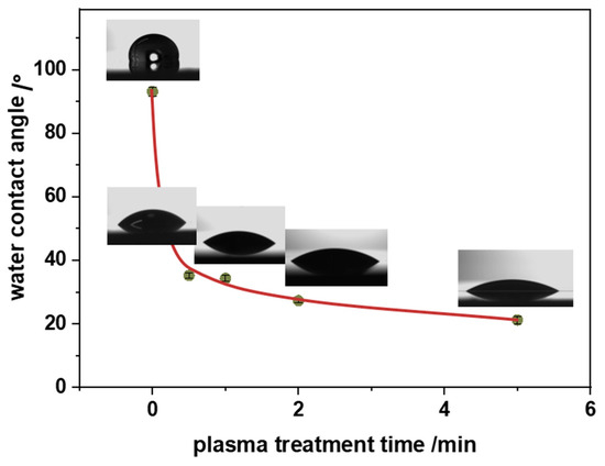 Changes in the water contact angle of the polypropylene surface as a function of oxygen plasma treatment time.
