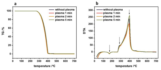 During the plasma treatment, several processes occur on the polymer surface that can be distinguished, such as cleaning, functionalization, and etching. The optimal strategy of polymer functionalization via plasma treatment is to add functional groups to the surface without disturbing the optimized bulk properties of the polymer. The effect of plasma treatment on the structural properties of the polypropylene can be easily checked by the TG/DTA measurements. The results of such thermogravimetric analysis are presented in Figure 5. The TG profiles clearly illustrated that the polymeric material is stable up to 270 °C independently of the plasma treatment time. This result strongly supports the working hypothesis that bulk polymeric properties are preserved. Additionally, there is no change in the melting temperature after the plasma treatment for 1 to 5 min (the typical melting temperature of polypropylene is approximately 170 °C [2]). Even the rapid thermal degradation of the untreated and plasma-treated polypropylene, observed in the temperature range of 270–400 °C, is the same within the experimental error.