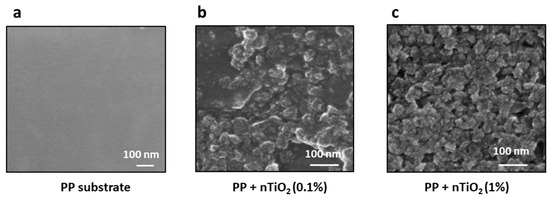 SEM images of the polypropylene substrate showing the effectiveness of TiO2 nanoparticle deposition on untreated and plasma-treated substrates: (a) pristine polypropylene surface, (b) TiO2 nanoparticles deposited on the untreated surface, and (c) TiO2 nanoparticles deposited on the plasma-treated surface.