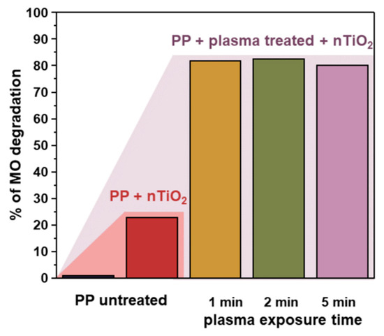 The effect of plasma treatment is schematically presented in Figure 9. It can be noted that a 1 min plasma treatment is enough to make a significant impact on the activity, and a further increase in the plasma treatment time does not result in any discernible changes To investigate the relationship between the photocatalytic activity and light absorption, UV light absorption measurements for the nanocomposites (nTiO2/PP) were also conducted. As shown in Figure S2 (Supplementary Information), absorption increases significantly with TiO2 loading. However, comparing these results with the data in Figure 9, where all the plasma-treated samples exhibit similar photocatalytic activity regardless of TiO2 loading, suggests that UV light absorption may not be the critical factor for the dye degradation.