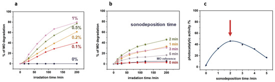 Figure 11a illustrates the effect of the initial concentration of the nTiO2 suspension on the degradation of methyl orange (MO) with the irradiation time. As the concentration of the TiO2 suspension used increases, the level of MO degradation increases in the whole-time range of irradiation. After 200 min of irradiation, for 0.1% TiO2 and 0.2% TiO2, approximately 40% and 60% degradation of the model pollutant was achieved, whereas for higher nTiO2 concentrations of 0.5% and 1%, the MO degradation reached 80%. As can be observed, the degradation of the model pollutant did not increase linearly with the content of TiO2. This may be attributed to the addition of the subsequent layers of nanoparticles, which lead to limitations in the accessibility of the TiO2 surface for photocatalytic processes.