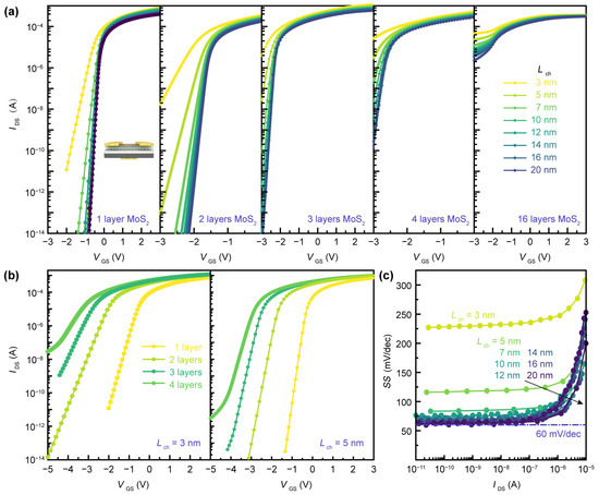 (a) The transfer curves of global back-gate MoS2-based FET with different number of layers. HfO2 is used for the gate insulator with a thickness of Tox = 3 nm. The length of source (drain) is equivalent to channel length Lch. Channel width Wch = 8 nm, and drain-source voltage VDS = 100 mV. (b) Layer-dependent characteristics of transfer curves of global back-gate MoS2 FET with 3 nm and 5 nm channel length, respectively. (c) The extracted sub-threshold swing SS from (a) as a function of drain current IDS. SS limitations are above 60 mV dec−1 at room temperature.