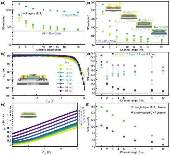 (a) Layer-dependent characteristics of SS for MoS2-based back-gate FET with various channel length. (b) SS as a function of channel length for four types of planar-gate FETs. BG, DG, SG, and CG represent back-gate, dual-gate, stacking-gate, and CNT-gate for MoS2-based FET, respectively. (c) SWCNT as channel materials in global back-gate FET and channel length dependent transfer curves. HfO2 is used for the gate insulator with a thickness of Tox = 1.8 nm. The width of source (drain) WSD = 2 nm and the radius of CNT R = 0.5 nm. (d) The relationships between SS and channel length extracted from (c) for CNT-based FET with various radii. (e) The linear transfer curves of CNT FET with a diameter of 1 nm at varying VDS. (f) DIBL comparison between single layer MoS2 and single-walled CNT as the channel of back-gate FETs in varying channel length, which indicates the short-channel effects within sub-10 nm.