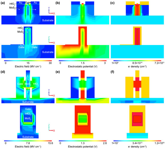 Electric field (a), electrostatic potential (b), and electron density (c) contour plots in the on-state (VDS = 100 mV, VGS = 3 V) for MoS2 FinFET. Electric field (d), electrostatic potential (e), and electron density (f) contour plots in top and cross view in the on-state (VDS = 100 mV, VGS = 3 V) for MoS2 GAAFET. The electrical characteristics of both devices were simulated by 3D models, and the profiles upper and lower each figure are from the XY and XZ directions of the model respectively.