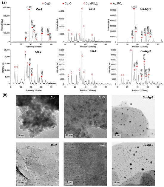 Then, XRD analyses were performed to determine the metallic species present in the different hybrids (Figure 2a). The peaks (110), (110), (200), (220), and (311) found in Cu-1 exhibited a high degree of correlation with the Cu2O standard data (JCPDS card 05-0667), while the peaks (111), (200), and (220) matched well with the JCPDS card 04-0836, which corresponds to Cu(0) [25]. Cu-2 presents peaks that correspond to the Cu2O standard, which were located in two theta positions of 36.8, 41.4, and 60.3. However, larger peaks that match well to the Cu3(PO4)2 standard data (JCPDS card no 00-022-0548) were observed. In Cu-3 and Cu-4, the predominant peaks correspond to the Cu3(PO4)2 standard. Furthermore, a higher crystallinity was observed for Cu-1, in comparison to Cu-2, Cu-3, and Cu-4, which present a more amorphous structure due to the low peak intensities encountered (Figure 2).