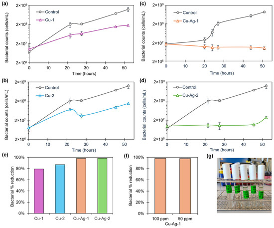 SFB antibacterial assay. Bacterial cell growth from 0 to 52 h with 100 ppm of (a) Cu-1, (b) Cu-2, (c) Cu–Ag-1, and (d) Cu–Ag-2 bionanohybrids. (e) Percentage reduction in bacterial cell counts after 45 h of exposure of the different hybrids in a 100-ppm concentration. (f) Percentage reduction in bacterial cell counts after 45 h of exposure of Cu–Ag-1 in 100- and 50-ppm concentration. (g) Evolution of the slime content in the test tubes after 2 days of exposition. Bacterial growth curves show the average of three replicas. Error bars correspond to the standard deviation.