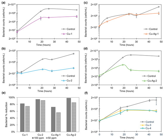 The Cu and Cu–Ag bionanohybrids were tested in a 100-ppm concentration against a starting SFB solution of 1·107 cells/mL. The growth of SFB was followed by taking different sampling points between 0 and 52 h. A decrease in the bacterial population was found on the SFB growth, especially after 24 h, compared to the controls (Figure 3). Percentage reductions in the cell count of 80%, 87%, 98%, and 98% were found for Cu-1, Cu-2, Cu–Ag-1, and Cu–Ag-2, respectively, after 45 h of exposition (Figure 3e).