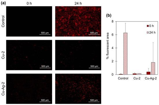 The metal coupons were submerged in a solution of SRB with an average concentration of 1∙107 cells/mL and the selected hybrids under anaerobic conditions. Samples were taken after 0 and 24 h. Then, the coupons were removed from the media and stained for fluorescent imaging. The analysis of the fluorescence images after 24 h revealed a minor bacterial growth on the surface of the coupons that were in contact with the bionanohybrids, compared to the controls (Figure 6a). The percentage of fluorescence area of the control samples indicated a bacterial occupation of 6.3% after 24 h. However, the fluorescent area percentage for the Cu-2 and Cu–Ag-2 samples was 0.1% and 1.8%, respectively (Figure 6b).