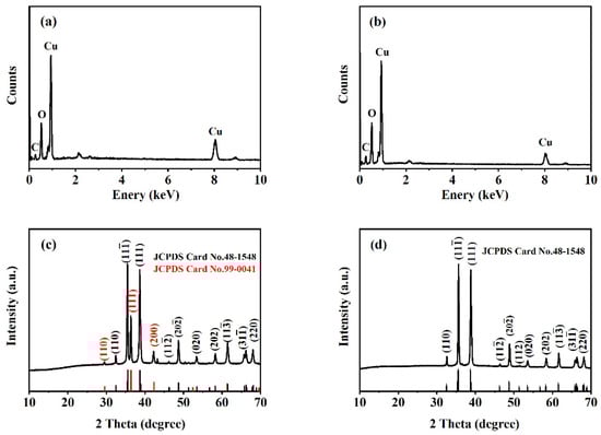The elemental composition and structure of two formed samples were analyzed. EDS reveals that the obtained products are composed of Cu, O, and C (Figure 2a,b). For the sample prepared at a salt bath baking temperature of 325 °C (Figure 2c), the diffraction peak at 32.52, 35.47, 38.92, 48.71, 53.52, 58.27, 61.55, 66.31, 68.17 degrees can be attributed to the (110), (11-1), (111), (20-2), (020), (202), (11-3), (31-1) and (220) planes of monoclinic CuO crystal (PDF # 48-1548), and the diffraction peak at 29.52, 36.31, 42.25 degrees can be ascribed to the (110), (111), and (200) planes of cubic Cu2O crystal (PDF # 99-0041). The XRD pattern proves that a CuO–Cu2O composite can be prepared. For the sample prepared at a salt bath baking temperature of 450 °C (Figure 2d), the main diffraction peaks correspond to the monoclinic CuO (PDF # 48-1548). XRD results suggest that the curled sunflower-shaped microstructure has high crystallinity and phase purity and proves the formation of a CuO–Cu2O composite.