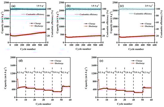 The reversibility is one of the key parameters for evaluating LIBs []. The rate performance of CuO–Cu2O@C composite and CuO@C composite at various current densities (0.2, 0.5, 1.0, 2.0, and 5.0 A g−1) was tested between 0.01 V and 3.0 V to evaluate the stability of the formed LIBs. For the CuO–Cu2O@C composite electrode (Figure 4d), a discharge capacity of 530.9 mA h g−1 can be reached at a current density of 0.2 A g−1. As the current density is set at 0.5, 1.0, 2.0, and 5.0 A g−1, the CuO–Cu2O@C composite delivers a discharge capacity of 461.9, 411.6, 360.6, and 290.5 mA h g−1, respectively. As the current density comes back to 0.2 A g−1, the discharge capacity reaches 551.9 mA h g−1 and maintains good stability, which indicates that the CuO–Cu2O@C composite electrode can be gradually activated and possesses significant reversibility []. For the CuO@C composite electrode (Figure 4e), the discharge capacity is 455.6 mA h g−1 at a current density of 0.2 A g−1. As the current density changes from 0.5, 1.0, 2.0, and 5.0 to 0.2 A g−1, the discharge capacity of 411.3, 353.8, 309.9, 244.1, and 480.6 mA h g−1 can be obtained, respectively. The results prove that the CuO–Cu2O@C composite possesses better rate performance than that of the CuO@C composite.