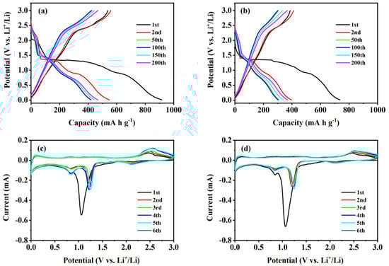 GCD curves tested at 1.0 A g−1 for the 1st, 2nd, 50th, 100th, 150th, and 200th cycles were analyzed to study the electrochemical mechanism of the two composites (Figure 5a,b). For the CuO–Cu2O@C composite, the initial discharge curve has two small voltage platforms; the sharp peak located around 1.28 V arises from the formation of the Cu2O phase, while the transition of Cu2O to Cu occurs at 0.88 V []. In the subsequent discharge curve, only one long voltage platform appears at 1.41 V. In the charging curve, one voltage platform at 2.41 V can be observed. A multiphase transition between CuO and lithium can be confirmed by the constant slope with several small plateaus []. Since the second cycle, the voltage distribution has remained basically unchanged, showing good electrochemical stability. The GCD test results agree well with the CV test results and further indicate that mixed-valence copper-containing oxides are in favor of the insertion of lithium ions []. For the CuO@C composite, the platform voltages during the cycling basically coincide with those of the CuO–Cu2O@C composite, but the specific capacities are lower than those of the CuO–Cu2O@C composite. The results show that the CuO–Cu2O@C composite electrode has the same Li+ insertion/extraction mechanism with CuO@C composite, and the mixed-valence copper oxides are more conducive to the insertion of lithium ions [].