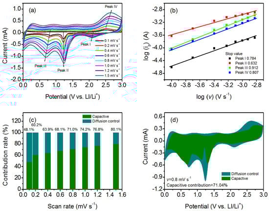 In the above equation, b reflects the determining electrochemical process. The b value near 1.0 means the electrochemical process is pseudocapacitive-controlled [,,]. Normally, the b value is calculated by the slope of log(i) versus log(v) for the different redox peaks. For the curled sunflower-shaped CuO–Cu2O@C composite electrode, the obtained b values of 0.784, 0.632, 0.912, and 0.807 for peaks I–IV mean that the electrochemical process is surface-controlled (Figure 6b). The surface-controlled process will contribute to fast kinetics, ensuring excellent reversible cycling properties and rate performance [,]. Moreover, the current response at a certain potential may be distinguished into a surface-capacitive effect (k1v) and a diffusion-controlled process (k2 v1/2) according to the following equation:
