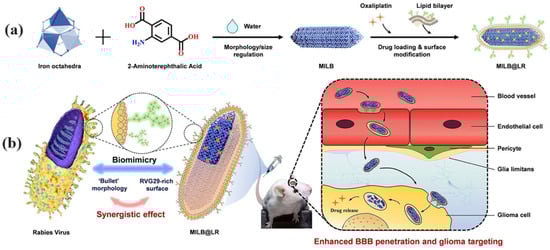 Glioblastoma multiforme (GBM) is a highly aggressive brain tumor, and the BBB presents a significant challenge for drug delivery. This novel approach uses a nanocarrier inspired by the rabies virus (RABV) called MILB@LR. By emulating the bullet-shaped structure and surface functions of RABV, MILB@LR can effectively penetrate the BBB and target brain tumors. The nanocarrier is based on the iron (Fe)-based MIL family of MOFs, which offer a controllable morphology, adjustable surface modification, and a high loading capacity. It features a lipid bilayer coating with the RVG29 peptide, which binds to nicotinic acetylcholine receptors (nAchRs) that are overexpressed on both BBB and GBM cells. This RABV-mimetic design allows MILB@LR (Figure 1a) to efficiently cross the BBB and accumulate in brain tumors. Loaded with the antitumor drug oxaliplatin (OXA), MILB@LR has demonstrated impressive efficacy in inhibiting tumor growth compared to methods that only replicate isolated features of RABV. In vivo studies have shown that MILB@LR effectively reaches the brain and penetrates deeply into glioma tumors, overcoming the barrier of drug delivery across the BBB, which typically restricts more than 98% of therapeutic agents (Figure 1b) [59,60].