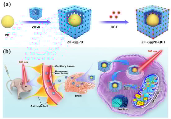 Parkinson’s disease (PD) is a progressive neurological disorder marked by motor dysfunction resulting from the degeneration of dopamine-producing neurons in the brain. Liu et al. investigated a novel approach by developing a ZIF-8@PB nanocomposite, where ZIF-8 was coated with Prussian blue (PB), forming particles with an average size of 107 nm and loaded with quercetin (QCT), a natural antioxidant aimed at treating PD (Figure 2a). This ZIF-8@PB-QCT nanocomposite demonstrated a strong response to near-infrared (NIR) light. The system utilizes PB’s photothermal effect to enhance BBB permeability, allowing QCT to enter neuronal cells and exert therapeutic effects directly in response to mitochondrial damage (Figure 2b). The drug release was assessed over a 24 h period, both with and without exposure to an 808 nm NIR laser. In the absence of the laser, only 13% of QCT was released, but with NIR laser application, around 77.96% of QCT was released from the ZIF-8@PB-QCT complex. This increased release was due to the heating effect, which enhanced the Brownian motion and led to the dissociation of QCT from the nanocomposite. The ZIF-8@PB-QCT nanocomposite significantly improved mitochondrial function and reduced PD symptoms in mouse models by increasing the ATP levels, decreasing oxidative stress, and repairing dopaminergic neuronal damage. These effects were attributed to QCT’s neuroprotective properties, including its anti-inflammatory, antioxidant, and anti-apoptotic actions, which were further amplified by the nanocomposite’s effective drug encapsulation and NIR-triggered release. The underlying mechanism involves the activation of the PI3K/Akt signaling pathway, highlighting the potential of this biocompatible, NIR-responsive system for treating neurodegenerative diseases by overcoming BBB barriers and targeting mitochondrial dysfunction [64].