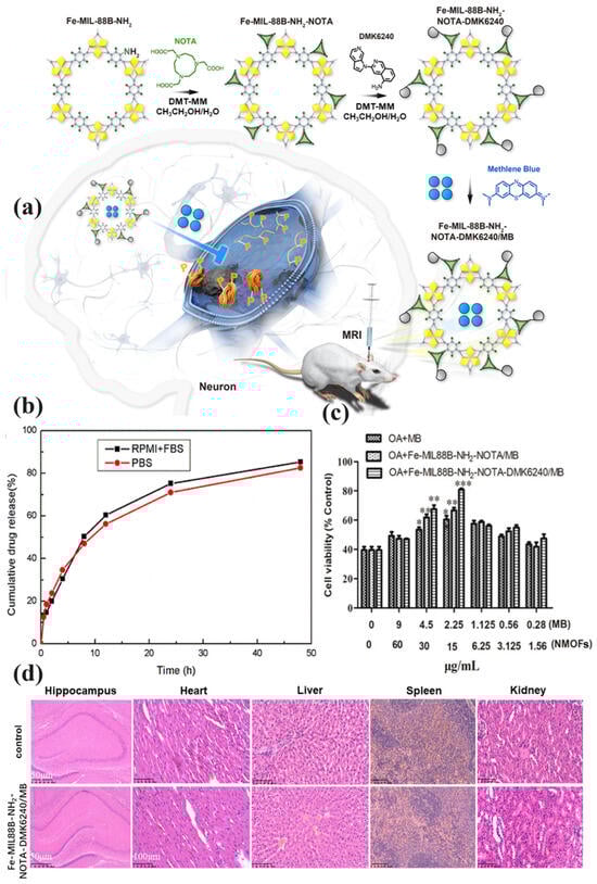 (a) Synthesis and application of Fe-MIL-88B-NH2-NOTA-DMK6240/MB; (b) MB release profiles from Fe-MIL-88B-NH2-NOTA-DMK6240/MB in buffer (pH = 7.4) and cell culture medium (RPMI + FBS); (c) cytoprotective effect of Fe-MIL-88B-NH2-NOTA-DMK6240/MB on OA-induced SH-SY5Y cells treated with MB, Fe-MIL-88B-NH2-NOTA/MB, and Fe-MIL-88B-NH2-NOTA-DMK6240/MB for additional 12 h; (d) histological changes in hippocampus, heart, liver, spleen, and kidney compared to saline control, assessed 14 days post-treatment with Fe-MIL88B-NH2-NOTA-DMK6240/MB [68].