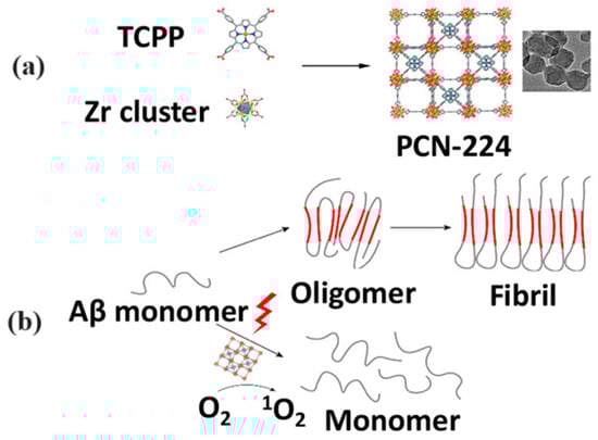 - Wang, J.; Fan, Y.; Tan, Y.; Zhao, X.; Zhang, Y.; Cheng, C.; Yang, M. Porphyrinic metal–organic framework PCN-224 nanoparticles for near-infrared-induced attenuation of aggregation and neurotoxicity of Alzheimer’s amyloid-β peptide. ACS Appl. Mater. Interfaces 2018, 10, 36615. [Google Scholar] [CrossRef] [PubMed]