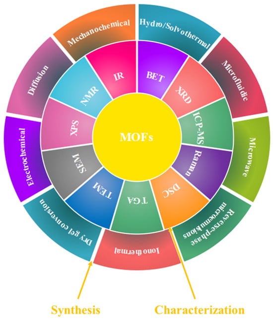 Understanding the structure, properties, and potential uses of MOFs requires a comprehensive characterization of the final product. This process involves employing a variety of analytical techniques to uncover both the physical and chemical attributes of MOFs. Powder X-ray diffraction (PXRD) and single-crystal X-ray diffraction (SCXRD) are used to determine crystal structures. Infrared (IR) and Raman spectroscopy help identify molecular vibrations. The Brunauer–Emmett–Teller (BET) method measures the surface area, while thermogravimetric analysis (TGA) and differential scanning calorimetry (DSC) assess thermal stability. Inductively coupled plasma mass spectrometry (ICP-MS) provides the elemental composition, and X-ray photoelectron spectroscopy (XPS) gives insights into the surface chemistry. Nuclear magnetic resonance (NMR) spectroscopy reveals dynamic and structural information for a number of nuclear species, while scanning electron microscopy (SEM) and transmission electron microscopy (TEM) offer detailed images of the morphology and internal structure of MOFs (Scheme 1) [20,21,22,23,24,25,26,27,28,29].