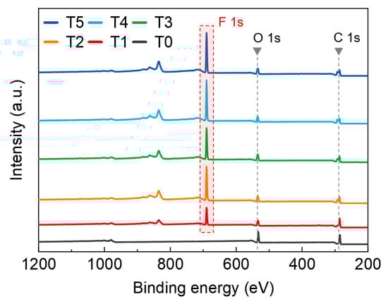 As shown in Figure 2, the surface of the untreated epoxy resin (T0) exhibits C 1s and O 1s peaks. After DBD plasma treatment, an additional F 1s peak is detected on the surface [42], indicating that the DBD treatment altered the chemical properties of the epoxy resin and facilitated the grafting of fluorinated functional groups onto its surface. Furthermore, as the processing time increases, the peak intensity of F 1s gradually rises, suggesting an enhancement in the fluoride grafting rate.