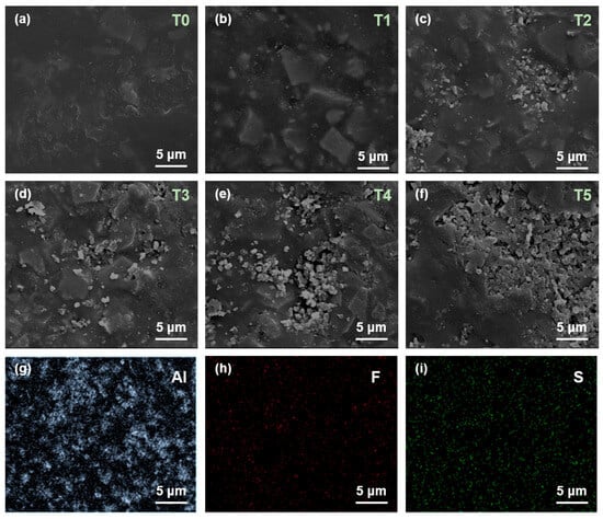 SEM image of surface morphology of (a) T0, (b) T1, (c) T2, (d) T3, (e) T4, and (f) T5. Element mappings extracted from T5 of (g) Al, (h) F, and (i) S.