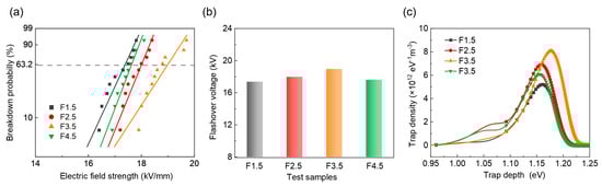 (a) The Weibull distribution of the breakdown probability of flashover voltage. (b) The flashover voltage of various samples extracted from (a). (c) The charge trap distributions of the samples.