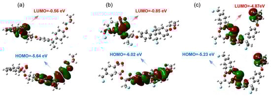 Geometric optimization is performed using Gaussian 16.0 on the three molecular structures to achieve a reasonable conformation. After that, a single-point energy calculation is conducted to further refine the structural energy for subsequent property analysis. During the calculation, the hybrid function and group basis set are selected as B3LYP and the 6-31G(d), respectively. The calculated results are imported into Gauss View 6.0, and the visualization of HOMO (Highest Occupied Molecular Orbital) and LUMO (Lowest Unoccupied Molecular Orbital) is achieved from the molecular orbital (MO) module [48]. The obtained results are depicted in Figure 10.