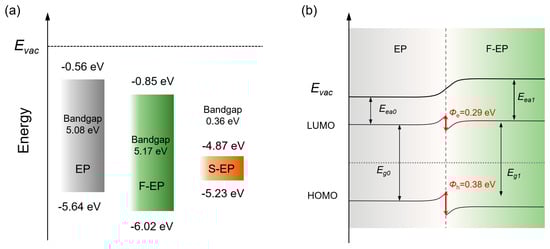 (a) A schematical diagram illustrating the energy band structure of EP, F–EP, and S–EP. (b) The energy band alignment of EP and F–EP.