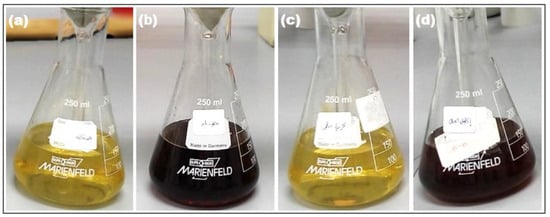 The general reaction that leads to the formation of AgNPs is the reduction of silver salt ions, Ag+, to metallic Ag0, which is typically a fast process []. The different components of the plant extracts, such as flavonoids, ketones, aldehydes, carboxylic acids, tannins, proteins, and phenolic compounds, act as the reducing and stabilizing agents []. The functional groups in these compounds, such as phenolic hydroxyl, carboxyl, and carbonyl groups, could be the reason for the reduction and stabilization process []. The synthesis of AgNPs was indicated first by a colour change in the reaction mixture (plant extract + AgNO3). The colour change is due to the formation of AgNPs []; they are known to exhibit a yellow or brown colour due to the excitation of their surface plasmon resonance (SPR) vibrations []. AgNPs were successfully synthesized using the extracts of Ginkgo biloba, Cichorium intybus, Adiantum capillus-veneris, and Rosmarinus officinalis plants, and the colour change of the reaction mixtures is shown in Figure 4. The solutions exhibit distinct colours due to the morphology of the resultant NPs, quantum size confinement, and/or surface plasmon [].