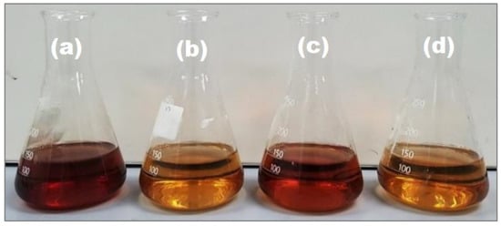 The plants’ extracts of (GB, AC, CI, and RO) were prepared by suspending 2.0 g of each plant’s powder in 100 mL of double-distilled water; then, using a digital orbital shaker, the suspended solution was shaken at 200 rpm for 2 h. After that, the solution was filtered using S&S filter paper grade 602 H. The obtained filtrates, shown in Figure 3, were stored in a refrigerator at 4–6 °C until use.