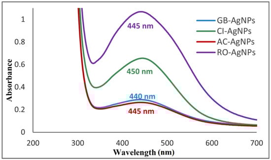 The bio-synthesized AgNPs (GB-AgNPs, CI-AgNPs, AC-AgNPs, and RO-AgNPs) (5 mL of 0.01 M AgNO3 with 7 mL of each extract (5:7 ratio)) were characterized using a uv-vis spectrophotometer, which showed SPR bands at 445, 440, 450, and 445 nm, respectively, as shown in Figure 5. The wavelength range 400–470 nm corresponds to AgNPs production. The peak locations in the spectra are primarily affected by the shape of NPs, temperature, and the dielectric constant of the medium, suggesting poly dispersibility of the synthesized AgNPs [], and the different shapes of the peaks could be due to the different reducing agents of the plants involved in the synthesis of the AgNPs [].